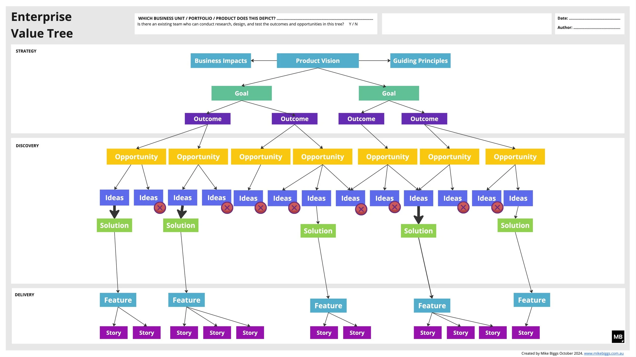 A Value Tree breaks down strategic business outcomes into progressively more granular opportunities, ultimately linking them to specific product capabilities. Unlike a traditional backlog or roadmap, the Value Tree is not product-centric — it is value-centric. This structure makes the relationship between strategic objectives and delivery efforts more explicit. It allows organisations to see how individual product investments contribute to shared goals, and where the most promising opportunities lie — especially if they don't fit neatly into existing product mandates. When maintained as a shared artefact, the Value Tree creates a common language for discussing value across teams and business units. A Value Tree specifically allows product teams to elevate opportunities to the portfolio level because the opportunity spans multiple products and services.